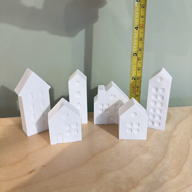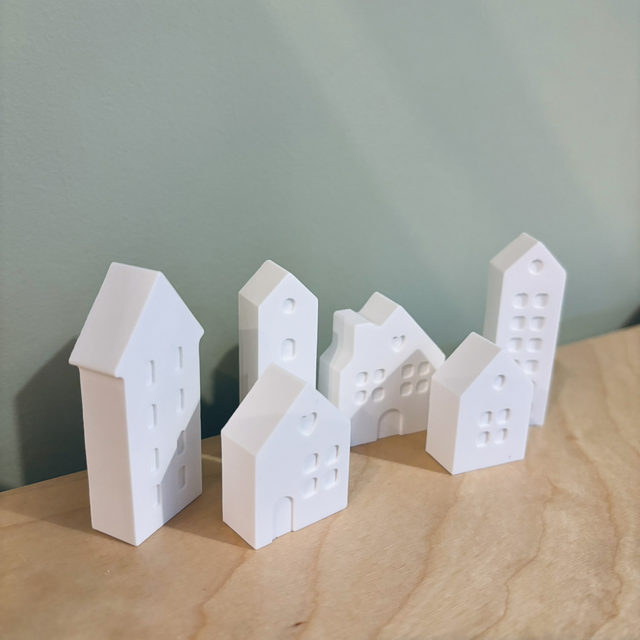 Six mini houses made from Eco Resin which gives a smooth white concrete feel.