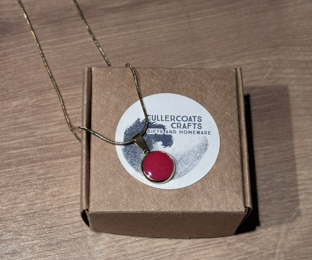 Handmade resin charm necklace in pink on a gold chain with adjustable lengths.